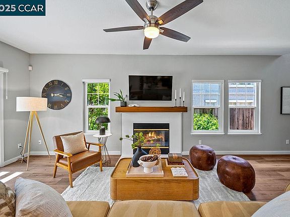 Modern Charm Meets Small Town Magic! Welcome to this swoon-worthy Stranahan home offering luxury vinyl plank flooring throughout the lower level & a bright, open-concept layout—unique to this model! The kitchen is a total showstopper, fully remodeled with quartz countertops, sleek L-shaped island, stylish backsplash, recessed lighting, & upgraded appliances. This space is made to impress. The flow from kitchen to dining to family room makes everyday living feel easy & connected, while a sliding barn door adds farmhouse flair to the inside laundry room. The powder room? Fully renovated with a fresh vanity, mirror, lighting, & toilet for a modern touch. Need storage? A deep under-stair closet has you covered! Upstairs, the updates continue with modern tile flooring, new vanities, updated lighting, & refinished showers in both the guest & primary bathrooms—giving you spa vibes without leaving home. Outside, enjoy a private backyard retreat that backs to scenic trails & features stunning Mt. Diablo views. The low-maintenance landscape, extended pergola, and brand-new concrete patio make it the ideal spot for summer BBQs, morning coffee, or sunset wine time. This home checks all the boxes & then some With trails, top-rated K-12 schools, restaurants, & festivals just 1-min away. NO HOA