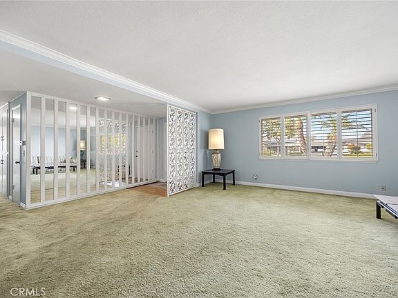 Built in 1964 this Country Hills single story home is located on a cul-de-sac, north facing and easy to access with only a small half step on the front entry. Situated to the right side of the cul-de-sac, cars driving into cul-de-sac will not disturb occupants in the evening and is good feng shui. The landscape is nicely designed with grass and shrubs lining a walkway from the driveway to the front door. It has a good feeling from the street. Walking through the entry, there are vestiges from the 1960's such as the decorative metal panels on the exterior and just inside the entry. Along one entry wall is a divided floor to ceiling mirror which makes the entryway to the living room space seem larger.