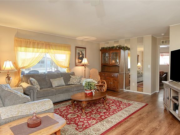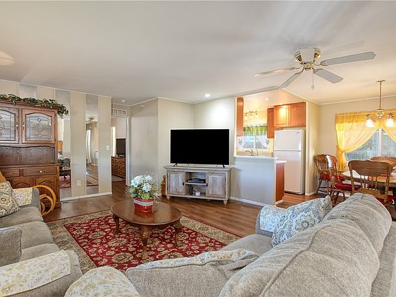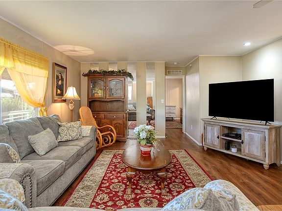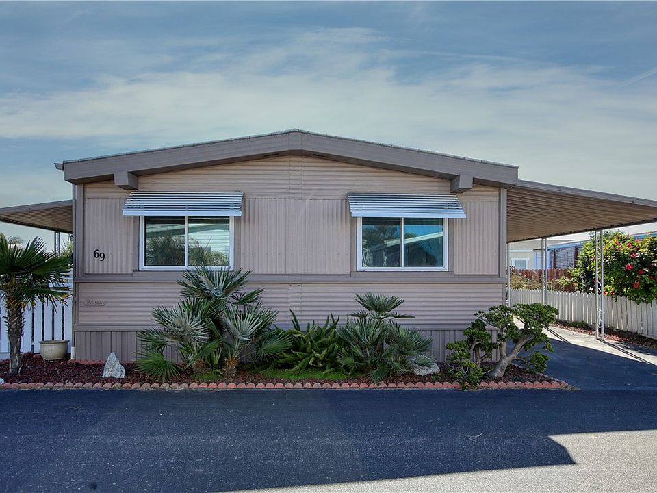 Beautifully maintained, spacious 3-bedroom, 2-bath manufactured home on a large corner lot in a friendly, age-restricted park just over a mile from the beach. The beautifully manicured fenced front yard features low-maintenance artificial grass and a large covered front porch, perfect for relaxing or entertaining. The home offers an updated kitchen, including elegant quartz countertops and a walk-in pantry. Behind the sizable carport, you'll find a practical storage shed for all your needs. This charming home combines comfort, convenience, and low-maintenance living in a desirable location.