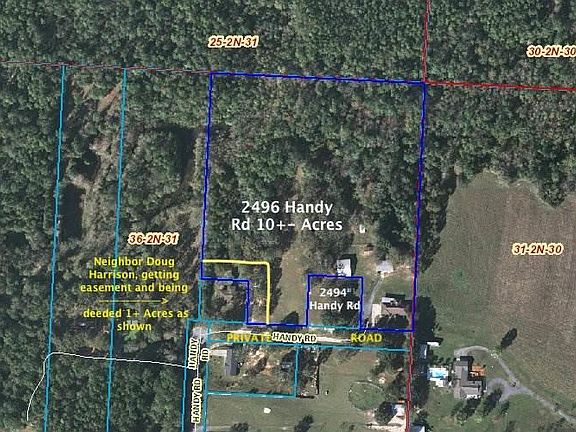Below Market Price to Settle Estate. This Estate Property Has it ALL. Spacious Brick 4 Bedroom, 3 Bath Home, 1500 S.F. Shop with 14' Eave Height & (2) 10' Roll-up Doors, Combo Chicken House and Pole Barn, Plus an Extra 3-Bay Metal Drive-Through Storage Building with Concrete Floors...All Situated on 10.5 Acres on a Private Road. The Property Backs Up to Over 1500 Pristine Acres. Horses are Allowed and the Open Pasture is Perfect for Equestrian Use. Built in 1988, the Home is 3577 Square Feet Under Roof, Including 2377 Heated and Cooled, Glassed and Screened Porches Totaling 740 Square Feet and a 500 Square Foot Double Car Garage. The 30x25' Great Room Has Soaring Cathedral Ceilings and Full-Wall Bricked Hearth and Wood Burning Fireplace. The Kitchen has Breakfast Room, Plentiful Wooden Cabinets, Newer Jenn Air Convection Oven and Jenn-Air Convection Microwave, Cooktop, Dishwasher, and is Open to the Great Room. A Separate Dining Room off the Kitchen is Ideal for Special Family Gatherings. Split Bedroom Plan with a Mother-in-Law Suite off the Kitchen. Newer CH/A Geo-Thermal System, 80 Gallon Hot Water Heater, All Electric Home. This Homestead is So Amazing, You May Never Want to Leave Home! The Charming Red Brick Home at 2494 Handy Road is Part of the Estate and Can be Purchased - MLS#552440.