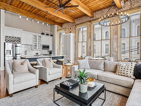 This one bedroom, one bathroom CORNER unit is quite unique. It offers NINE windows, which is hard to find in the historical district, making it very bright in every room, and it's perfect for watching the Mardi Gras parade, Dickens on the Strand, and other events. It has wood floors and wood ceilings, open concept with an island kitchen that seats 4 comfortably. The kitchen offers a built-in pantry, S/S appliances, a large one bay sink and a built-in wine rack. This unit comes with a washer and dryer. In 2023 a new water heater, HVAC, new Surge protected electrical panel, and a dehumidifier was installed. Notice the custom millwork throughout, and remote controlled Hunter Douglas blinds on every window. The bathroom has large shower and separate water closet. A brand new elevator is being installed, a new parking garage is under construction along with a swimming pool, and the roof was replaced in 2024, all assessments have been paid. The owner is the listing agent. No STR allowed
