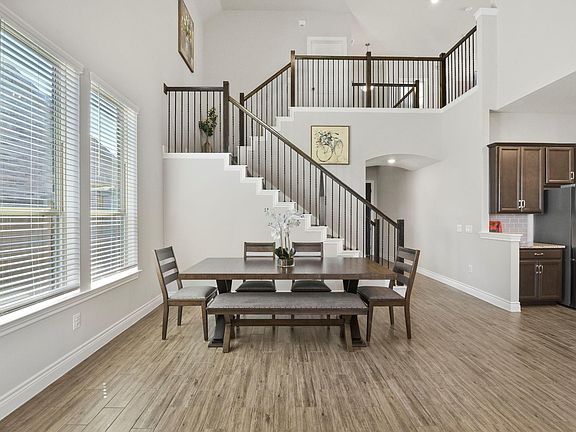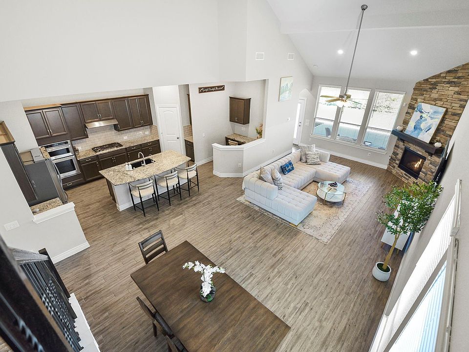 This sophisticated residence defines modern luxury & seamless functionality.The dramatic open Great Room, where soaring ceilings & expansive windows bathe the space in natural light. A striking, floor-to-ceiling stacked stone fireplace anchors the room, creating an ideal setting for elegant entertaining and cozy evenings.The gourmet kitchen is a chef’s dream, featuring premium granite countertops, built-in stainless steel appliances, and atmospheric under-cabinet lighting. The tranquility continues in the main floor primary suite, which offers a luxurious, spa-inspired shower for ultimate relaxation. Functionality is flawlessly integrated with a private dedicated home office and a smart, built-in planning center. Upstairs, a spacious game room provides a perfect media or play zone, complemented by three generously sized secondary bedrooms. The private outdoor retreat ensures unmatched serenity, thanks to the highly desirable feature of no rear neighbors.