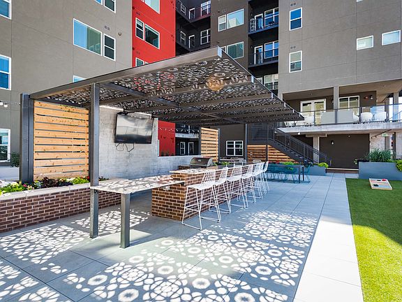 - Exterior features: *In Select Units, BBQ/Picnic Area, Bicycle storage, Bike Wash, Courtyard, Free Weights, Guest Room, High Ceilings, High-speed Internet Ready, Kitchen Islands, Large Pantries*, Night Patrol, On-Site Maintenance, On-Site Management, Package Receiving, Pet Groom Room, Quartz Countertops, Short Term Lease, Smart Thermostats, Spacious Bathrooms, Spanish Speaking Staff, Stainless-steel Appliances, Sundeck, TV Lounge, Tile Backsplash, USB Outlets, Undermount Sinks, View Type: Downtown Views, View Type: View