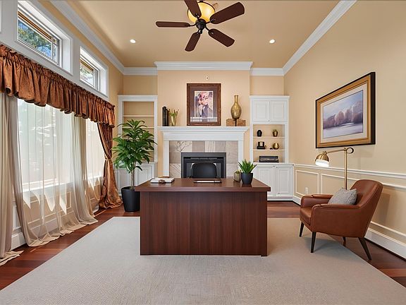 Towering treesHome officeBrazilian hardwood floorsCustom bookshelvesForest viewsGranite countertopsQuiet cul-de-sac