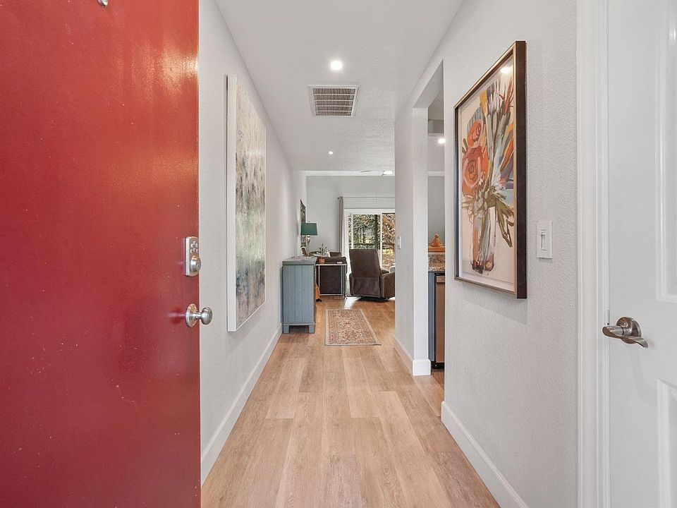 This freshly renovated upstairs unit is walking distance to Lodi Lake offering paddleboard and kayak rentals, picnic and playground areas and a nature trail. There are several restaurants nearby including Wine and Roses Restaurant and Spa with its new Towne Corner Cafe. When you enter, there is light surrounding every room with new windows, sliders and can lighting. The luxury vinyl floors flow throughout. The kitchen has painted cabinets, brand new stainless appliances, sink/faucet, a granite slab counter with a wood-top reinforced bar. The flex space next to the kitchen has a newly framed doorway ready for a door or curtain that is perfect for a work/guest space or maybe yoga? The living room has vaulted ceilings with a slider to the balcony. There is a new dual sink vanity with quartz counter and shower surround. The bedroom also has a slider to the balcony and a barn door at the closet. The washer/dryer space is hidden behind a closet door. This unit is so light and airy with new texture and painted walls. A designated covered parking space is included. If you are looking for a move-in ready space, you have found it!
