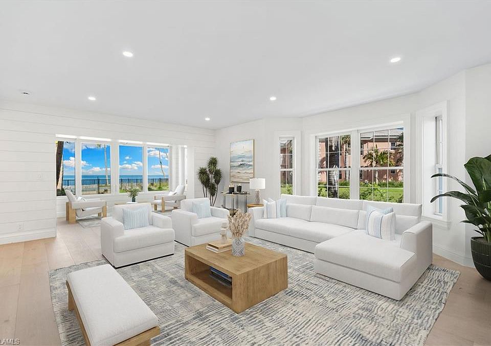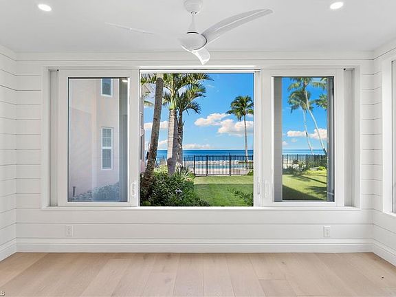 The perfect beachfront cottage: this two-bedroom, two-bath villa in the Shores of Naples offers a fully renovated interior and is just steps away from the sugary sands of Naples Beach. Masterfully crafted by BCB, the light and bright interior is luxurious and neutral, ready for you to personalize with your own design taste. Finishes such as honed Carrara countertops and backsplash, European white oak floors, Bosch and Miele appliances, and custom shiplap walls are the perfect touches to complement the colors of the coast. Residents and guests will appreciate the spacious kitchen with ample storage and an oversized island, all seamlessly flowing into the family and living rooms, ideal for gatherings. Step outside and watch the sunset over the Gulf every night—Shores of Naples Villa #1 offers beachfront living at its finest.