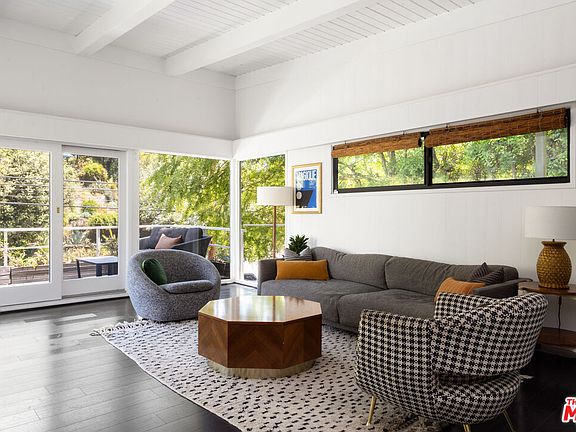 Tucked behind privacy hedges on a gated corner lot in the heart of Laurel Canyon, this 1953 post-and-beam masterpiece blends classic mid-century architecture with thoughtful modern updates. Originally designed by Alexander Krajeski & Associateswith the architect's own design studio still part of the layout this airy 3-bedroom, 4-bath retreat also includes a separate studio with its own entrance, plus an additional bonus room, making it a rare find for creatives seeking inspiration, serenity, and flexible space. The main living area exudes vintage charm with vaulted ceilings, original architectural details, fireplace, clerestory windows in the dining room, and skylights. Floor-to-ceiling sliders open to a deck, dappled with oak-shaded sunlight and surrounded by lush greenery. Entertain effortlessly in multiple outdoor zones, including a gated grassy yard, built-in BBQ kitchen with fridge, and a secluded patio featuring a Softub hot tub. The kitchen has been reimagined with Semi-Handmade cabinetry, a premium ILVE range, and a Samsung smart refrigerator. The studio formerly connected to the main living room via a spiral staircase, with plans available to restore the access features a living area, bedroom, bath, and its own private patio. A comprehensive security system with cameras, door and window sensors, and gated entry offers peace of mind. Ideally located just moments from Wonderland Avenue Elementary, this soulful, light-filled hideaway captures the essence of canyon living with timeless style and modern function.