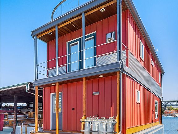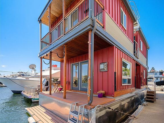 Big Red // Spacious front-row houseboat with a magnificent view of Lake Union and Seattle landscape. Enjoy sunrise coffee and sunset wine from 2nd-floor balconies on each end or better yet, from the expansive rooftop deck towering over the Northlake waterfront community. Recently rebuilt houseboat including Sherlock aluminum hull, Peter Proctor craftsmanship in the two bedrooms, spacious living room, and elegant kitchen-dining area. Ideally located on the Burke-Gilman trail that takes you to Fremont, the downtown tech corridor, and UW. Enjoy a spacious front porch, a wide swim step for easy swimming and boating access, an elegant shower, and bathrooms. Huge hull basement for storage.