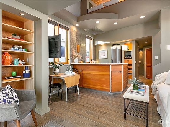 Experience the unique charm of lakeside living in this extraordinary home, aptly named "Woonboot," the Dutch word for houseboat. This NW contemporary features a vaulted barrel ceiling that fills the space w/natural light. The home has been extensively remodeled with no expense spared, offering wood & cork floors, kitchen w/concrete & quartz countertops, stainless backsplash, custom cabinetry, & high-end appls. The tiled ¾ bath boasts a copper sink. Upstairs, the lofted bedroom incls. a built-in bed, workspace, & a private deck—ideal for enjoying your morning coffee. Substantial storage, w/easy access to the cargo hold for additional stowing. Situated on a southern dock, with delightful views of Lake Union & Seattle skyline.