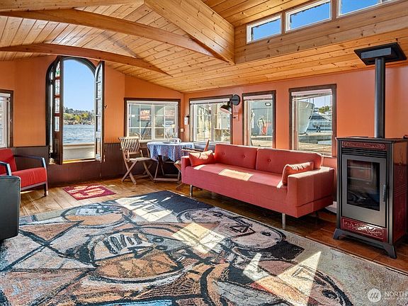 Uncompromising Lake Union views & intelligent design combine to create the ultimate in houseboat living. Easy water access with the last slot on the dock, you’ll find no end of both city views and unrestricted lake vistas. Step into this houseboat & find the perfect gathering spot with a wide interior, a thoughtful kitchen w/all the fixings & impressively vaulted ceilings throughout. A barn door leads to a ¾ bathroom, and the spacious living room offers easy deck access through artful stained glass doors. Upstairs, find a welcoming bedroom, complete with a large closet. Offering a perfect location (you’re just minutes from downtown Seattle, lake-centric recreation, and more), this houseboat is the perfect place to call home sweet home.