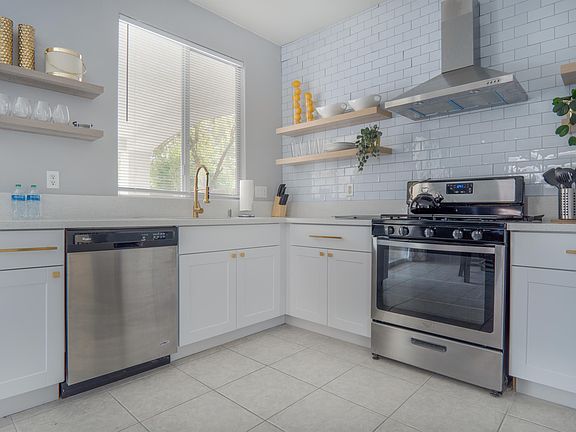 Renovated home, Quartz countertop, stainless steel appliances; Warm, clean, and cozy; Great floor plan one-story home with three bedrooms, two baths, and a two-car garage. Large eat-in kitchen, living room, family room, and covered patio located near Sunridge Park, zoned for sought after Lamping elementary school and Coronado High School, close by five star Charter school, Coral Academy.