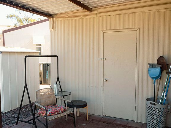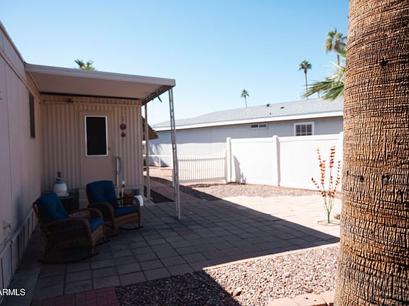 Tucked deep within a secure, gated 55+ community, this charming 2-bedroom, 2-bath manufactured home sits on a spacious corner lot with beautiful desert landscaping and a perfect mix of sun and shade. Fully wheelchair accessible, it features a front entry ramp, mobility-accessible bathroom and bedroom, water softener, tankless water heater, new fixtures, and an electronic keypad lock. The primary suite offers a vintage touch with an original avocado tub and separate shower in excellent condition. Cozy and inviting—ideal for full-time living or enjoying Arizona's perfect winter weather.