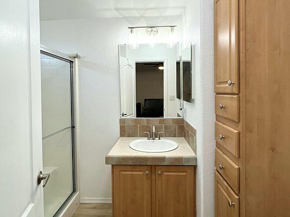 Move-in ready and full of charm! This 1-bedroom, 2-bath home features an open floor plan with stylish vinyl plank flooring and a spacious on-suite bathroom. The covered carport fits 2-3 vehicles, plus there's a Tuff Shed for extra storage. Located in a welcoming community with walking trails, a pool, spa, and clubhouse full of activities—perfect for active, friendly living. Land lease community.