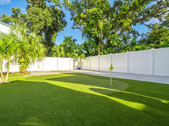 Enjoy your mornings in the front Florida sitting room or relax in the living room, which has seating for four. The dining room seats four, and the kitchen features a bar with seating for two. Step outside to the backyard, which includes a special putting green, outdoor seating for six, a fire pit, and a grill, perfect for entertaining or relaxing evenings. Bikes are on-site for exploring the neighborhood.