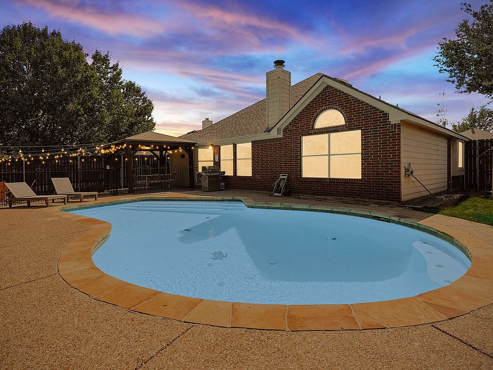 Outdoor swimming poolSleek modern appealStylish dining areaPrivate pool oasisFully fenced yardPatio backyard oasisPlush mattresses