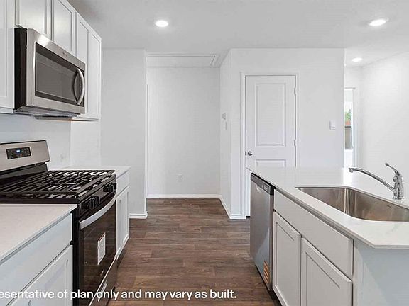 The Estero is a charming one-story home in Canterra Creek. This 4-bedroom, 2-bathroom home offers 1,573 sq. ft. of living space with a 2-car garage. The open-concept layout features a gourmet kitchen with granite countertops, shaker-style cabinets, stainless steel appliances, and flows seamlessly into the dining and living areas.