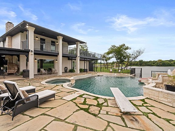 Welcome to your private lakeside paradise! Set on a generous 1.3 Acre lot, this unique residence takes full advantage of its picturesque surroundings with sweeping views of the water, sunsets, and park like setting. Whether you're lounging by the sparkling pool, soaking in the spa, or hosting friends on the oversized covered patio, this place is built for making memories. Two balconies give you even more space to relax and enjoy the peaceful scenery. Inside, the home features expansive living areas; three distinct spaces designed for entertaining, family time, or quiet moments. The main floor includes 3 well appointed bedrooms and 2.5 baths, while the upper level adds 2 more bedrooms and a full bath, perfect for guests or a growing household. Unique designer touches throughout. For a little extra fun, there's an in-ground trampoline ready for action. A circular drive and four covered parking spaces ensure convenience and ample room for family and guests alike. This lakeside retreat is the perfect mix of comfort, fun, and natural beauty. Ready for you to move in and enjoy!