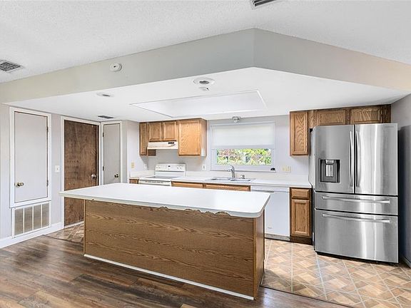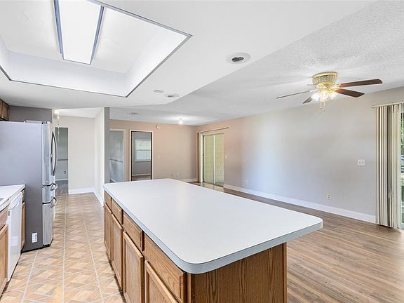 Welcome to this 3-bedroom, 2-bath home in the Oak Run community of Kissimmee. Offering 1,554 square feet of single-story living space, this residence features an open layout with a spacious family room, dining area, and an adjoining kitchen with a large island and stainless-steel refrigerator. The split-bedroom design provides privacy for the primary suite, which includes a walk-in closet and private bath. Two additional bedrooms share a full hall bath, ideal for family or guests. Sliding glass doors lead to a large screened patio with dual ceiling fans—perfect for relaxing or entertaining while enjoying views of the backyard with mature trees. The home also features updated flooring throughout the main living areas, a two-car garage, fresh landscaping, and a newer roof for added peace of mind. Conveniently located near schools, shopping, dining, and major highways—with no HOA—this property is a great option for homeowners or investors seeking comfort, convenience, and value.