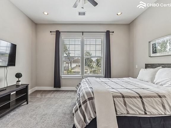 Upstairs, there are three spacious bedrooms, each equipped with a TV and comfortable bedding. The main bedroom has an enormous walk-in closet with more than enough shelving and storage solutions.