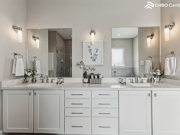 The main bedroom has access to a bathroom with a tile shower with a rainfall shower head, providing a great escape. There's also a deep soaking tub, marble counters, and a double vanity. Plenty of lighting makes this a great place to get ready in the morning.