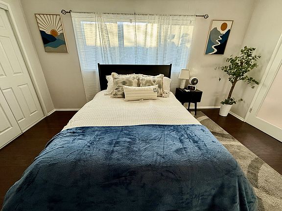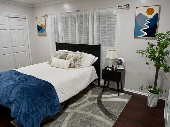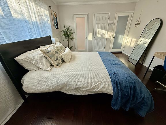15' x 12' furnished master bedroom with ensuite bathroom for rent. Located inside a single-family home, this spacious master bedroom comes fully furnished and tastefully decorated. It includes a queen bed, nightstand, computer desk with chair, 48" mounted TV and a full-length mirror. The room features two 6' closets with built-in drawers, shoe cubbies, additional shelves, and dual hanging racks for clothes. There is also a 3' utility closet on the opposite wall for extra storage. The flooring is durable vinyl faux wood planks, and the room is stocked with linens, towels, and pillows.
