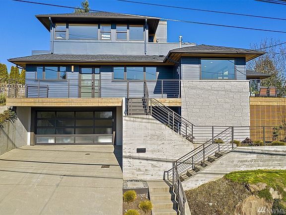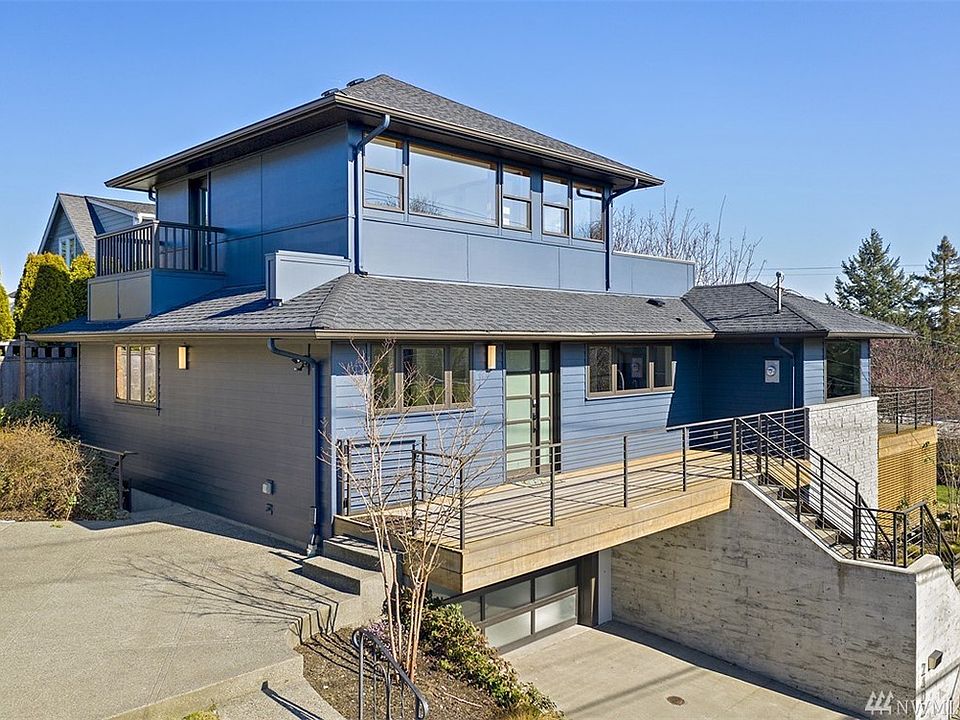 Impressive contemporary corner lot home with views of Elliot Bay, Mt. Rainier, Queen Anne, & Bayview park! Bright & airy, gleaming hardwoods, folding glass doors, & large view deck. Versatile floor plan perfect for today's living. Custom designed chef's kitchen w/ quartz counters, luxe appliances & high-end cabinetry. Master bedroom w/ en suite & French doors to private view deck. Lower level 1 bed/1 bath MIL w/ kitchenette & W/D, w/ sep entrance.