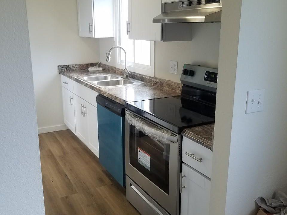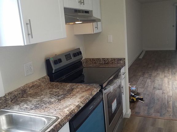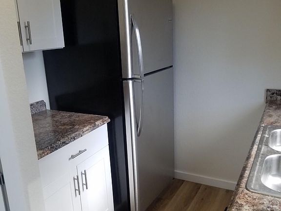 Kent/Midway/Des Moines. Easy freeway access. Near Highline Community College. Completely remodeled one bedroom one bath with new kitchen, appliances, flooring, bathroom and paint. Main floor of a 4-plex. Sliding glass door off living room. Electric baseboard heat. About 650 square feet. Built 1986. Two reserved parking. Closets in living room. Mini-blinds. Community laundry room. Dark wood cabinets. Small balcony. Rent includes water/sewer/garbage.