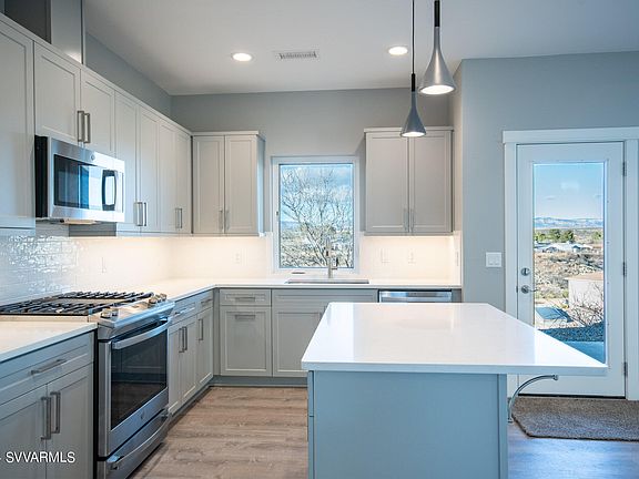 It's like living In your own world, this newly completed custom home sits on a private flag lot with drop dead views of Sedona red rocks, and Mingus Mountain. Boasting 3 bedrooms and 2 bathrooms, it features meticulous design, soft-close cabinets, quartz countertops, and luxury vinyl plank flooring. The kitchen is a chef's dream with stainless steel GE appliances, under-cabinet lighting, and ample counter space. A spacious laundry room adds convenience. The living room showcases panoramic views through upgraded vinyl picture windows and elegant recessed can lighting. The master suite is a serene retreat with a walk-in closet and a beautiful ensuite bathroom featuring a tub and walk-in shower. Outside, covered front and back patios provide year-round enjoyment. The property includes gutters and french drains around the home. Situated at a quiet cul-de-sac's end, this home offers privacy and tranquility, yet is a short drive from excellent restaurants and amenities. Don't miss the chance to own this impressive Cottonwood home! Schedule a showing now.