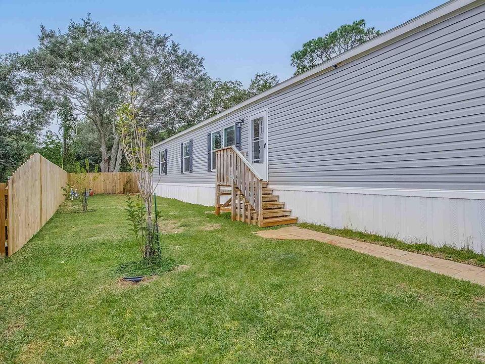 Built in 2022, this beautifully maintained 3-bedroom, 2-bath mobile home offers the perfect blend of comfort and Florida coastal living. With approximately 1,150 square feet of open-concept space, the home features a thoughtful split floor plan that provides both privacy and flow. The bright family room opens seamlessly to the kitchen, where stainless steel appliances, a center island, and ample cabinet space make everyday living and entertaining easy. The primary suite is tucked at the back of the home and includes a walk-in closet and private bath. A dedicated laundry room off the kitchen adds convenience and features a secondary door leading to the fenced yard. Your other two bedrooms and hall bathroom are located at the front of home. Outside, you’ll find a completely fenced yard and a tool shed for added storage. The community offers a true Florida lifestyle with a pool, clubhouse, secure boat storage, and private boat launch and pier—perfect for enjoying the outdoors. Conveniently located off Gulf Beach Highway, this home provides easy access to Perdido Beach, Pensacola Beach, NAS Pensacola, and Downtown Pensacola. Call to schedule your showing today!