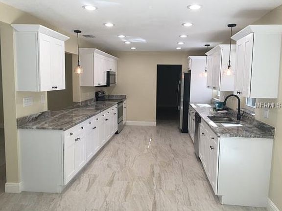 Large Remodeled 4 Bedroom 3 Bath 2 car Garage with pool. 2704 ft.² under AC. New roof, new well and Tank, new dual zoned ACs, Huge master bedroom, With supersized bathroom dual vanities, large walk-in shower. Large walk-in closet. Guest suite on the main floor and two large secondary bedrooms. Beautiful galley style kitchen, White shaker all wood cabinets, with fantasy brown granite. 12 x 24 flooring throughout, carpeted areas in bedrooms. Large living room over looking pool. Close to USF, Carrollwood. 20 Minutes to downtown.