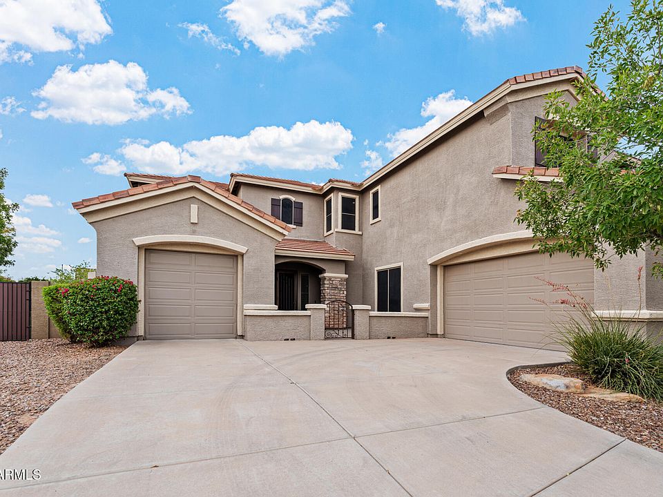 Your DREAM home with POOL is here in Anthem! Nestled on a large pie-shaped lot on a cul-de-sac, this gorgeous two-story residence has all the bells & whistles. Offering 4 beds, 3 baths, split 3-car garage, RV gate, great curb appeal, & a manicured landscape. The gated courtyard is just the beginning! The interior exudes elegance with vaulted ceilings, abundant natural light, a neutral palette, recessed lighting, and plush carpet & wood-look flooring in all the right places. Excellent floor plan showcasing a formal living & dining room and a separate family room w/electric fireplace! The impressive kitchen boasts SS appliances, quartz counters, a designer tile backsplash, ample white cabinetry, a walk-in closet, a center island, and a peninsula w/breakfast bar. Versatile den for an office! One bedroom and one bathroom complete the downstairs. For added functionality, you have three cozy lofts await upstairs. Enter the double-door primary bedroom to find an ensuite with two vanities, spa-like shower, and a walk-in closet. Beyond interiors, the spacious backyard holds its own charm! Designed for ultimate relaxation and entertainment with a covered patio, exterior fireplace, built-in BBQ, lush lawn, artificial turf, and a refreshing pool. What's not to like? See it! Love it! Live it!