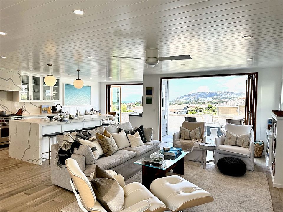 The open concept plan brings seamless indoor-outdoor living ingrained in its DNA. Relax in the comfortable Great Room opening onto the pleasant ocean view patio. The kitchen is defined by a large quartz island counter seating six, Wolf 6 burner gas range, Sub-Zero refrigerator and microwave, a custom built breakfast area, a separate bar with sink and auxiliary Sub-Zero fridge.