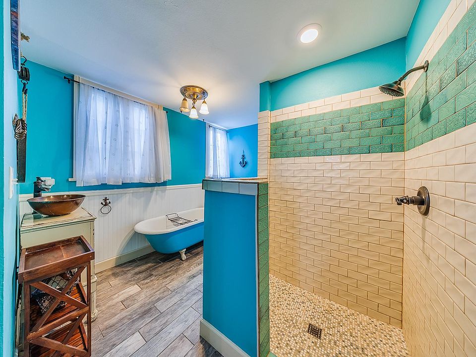 Outdoor showersHigh ceilingsBeautiful wood floorsDual showerClawfoot tub and shower