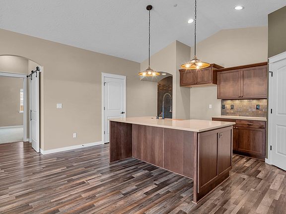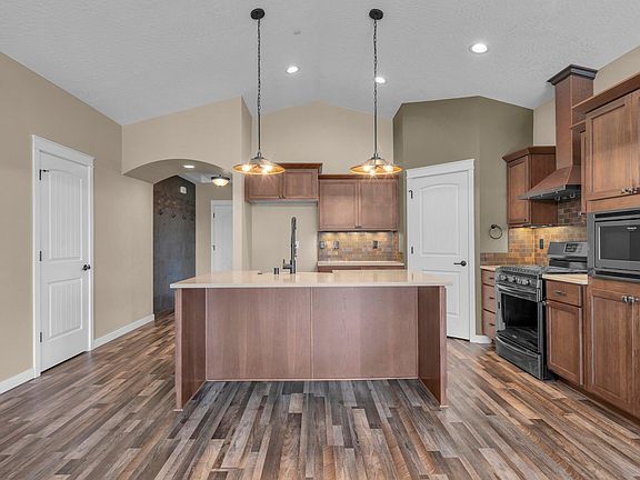 Gas fireplaceEat-at islandSolar panelsTall ceilingsWalk-in closetDouble vanityTiled standing shower