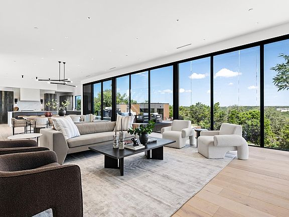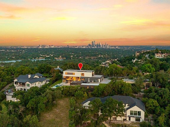 Elevated Modern Living in the Heart of West Lake Hills Poised atop one of West Lake Hills’ most coveted ridgelines, 2404 Camino Alto is a bold architectural statement brought to life by acclaimed Foursquare Builders and refined by the design team at SLIC Design. Spanning 6,335 square feet across three meticulously crafted levels, this modern estate offers a rare convergence of elevated design, effortless livability, and awe-inspiring Texas Hill Country views. Walls of floor-to-ceiling glass—anchored by a soaring 46-foot window wall—frame sweeping panoramas of rolling hills and golden sunsets. Inside, 11-foot ceilings and wide-plank Bella Cerra Ravello white oak floors create a serene backdrop for the open-concept living spaces. At the heart of the home, a striking chef’s kitchen pairs sculptural minimalism with top-tier performance—featuring Italian cabinetry, a 10-by-5-foot island, Wolf cooktop and oven suite, and a 102-bottle Sub-Zero wine fridge. Designed for seamless indoor-outdoor entertaining, the main level includes a 750-square-foot deck with built-in Coyote grill—perfect for evenings above the treetops. The primary suite is a private retreat with its own terrace, spa-style bathroom, and custom 240-square-foot closet. Four additional en-suite bedrooms occupy the upper floor, accompanied by a flexible lounge, study nook, laundry, and a 440-square-foot covered terrace wired for media. A rooftop stairway ascends to a 200-square-foot viewing terrace offering miles of 360-degree vistas of Lake Austin, downtown, and the surrounding hills. On the lower level, a spacious flex room with full bath opens directly to the covered poolside terrace—ideal for a media room, home gym, or game lounge. *Gym images are only a rendering of one of many possible uses of the flex space. A detached 640-square-foot accessory dwelling unit with full kitchen, bath, and laundry connections—perfect for guests, a creative studio, or private office.