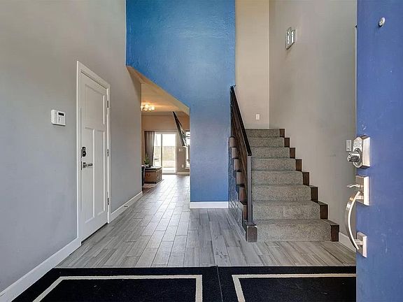 As you step inside, you're greeted by a dramatic 18-foot foyer and striking stairwell design. The oversized windows and double sliding doors flood the spacious living room with natural light.