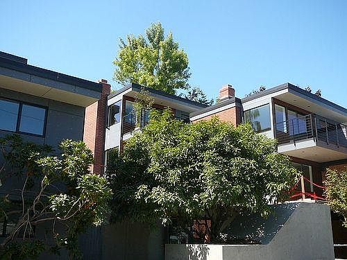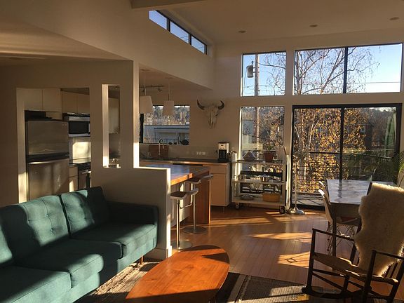 In a unique, mid-century modern building with its own private entrance and patio. SE exposure! Blond vertical grain bamboo flooring throughout, with kitchen, entry and bath flooring (heated) in Vermont black slate. Butcher block kitchen island countertop.