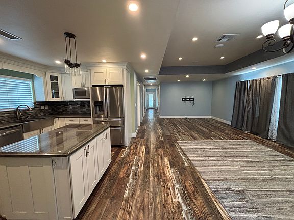 Inside, the open-concept layout seamlessly connects the kitchen, dining room, and living room, ideal for entertaining. The updated kitchen features custom cabinets, granite countertops, an island, and stainless steel appliances.