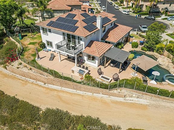 Exquisite Cul-de-Sac Home with Panoramic Views. Situated on a premium, elevated lot, this recently re-piped 5-bedroom, 4.5-bath residence offers breathtaking city light and hillside views. Enhanced with a fully paid-off solar energy system and a whole-house water filtration system, it combines elegance with modern efficiency. Step inside to warm hardwood floors, formal living and dining rooms, and a chef’s kitchen featuring a center island, white cabinetry, stone finishes, Viking 6-burner range, dual ovens, microwave, walk-in pantry, and serene garden views. The family room boasts a stacked-stone fireplace, custom built-ins, and stunning views of the backyard oasis. The main level includes a guest suite with en-suite bath and a dedicated office with in-wall, high-quality cabinetry—ideal for work-from-home or easily convertible into a sixth bedroom. Upstairs, the luxurious primary suite offers a private balcony, dual walk-in closets, granite-topped vanities, a soaking tub, stone flooring, and a separate walk-in shower. Additional bedrooms include a Jack-and-Jill with individual vanities and a private en-suite suite. The entertainer’s backyard features a new pool and spa with Baja step, iPad-controlled heating, lighting, and waterfall, plus a built-in BBQ, fire feature, and an enchanting English garden with ambient lighting. Located in a desirable community with private lake access, minutes from premier shopping and dining. Additional interior photos coming soon.