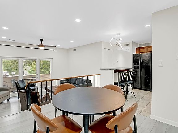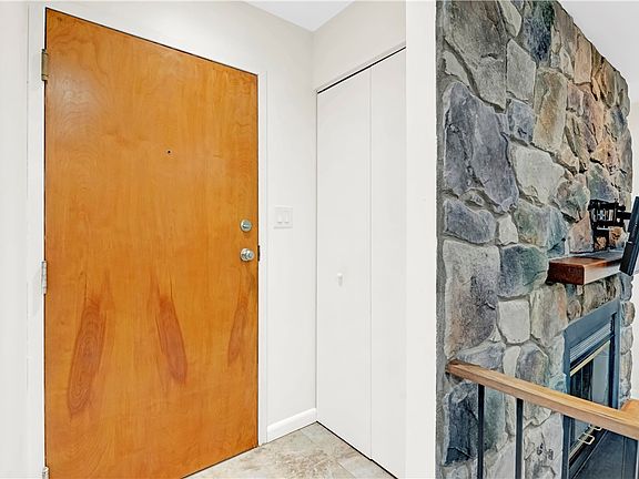 Stone gas fireplaceBar-height islandTile floorsGranite countersNewer vanitiesUpdated cabinetryCeramic-tile shower surround