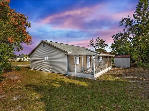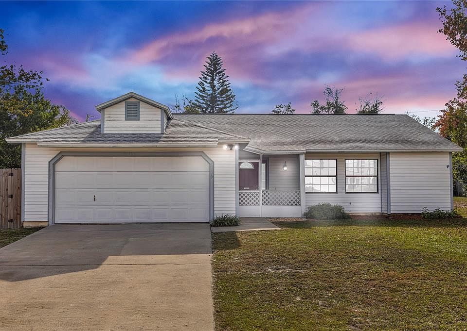 Step into this maintained 3-bedroom, 2-bathroom home—a perfect opportunity for a first-time homebuyer or downsizing—nestled on a generous 0.25-acre lot where comfort meets convenience. Featuring a split floor plan with vaulted ceilings and tile flooring throughout the main living areas, the home feels open, airy, and inviting from the moment you walk in. The kitchen is equipped with newer Whirlpool appliances. Peace of mind comes easy with a 2022 roof, new electrical panel installed in 2024, and an A/C unit replaced in 2018. Outside, enjoy the best of Florida living with a spacious screened-in patio overlooking a private backyard framed by a peaceful wooded backdrop—perfect for morning coffee, weekend gatherings, or unwinding after a long day. The fenced-in side yard is ideal for pets, while fruit trees add charm and character to the outdoor oasis, and the shed along with the garage provide plenty of additional storage. Great location in Deltona. Schedule your private showing today. This home may be under audio or visual surveillance.