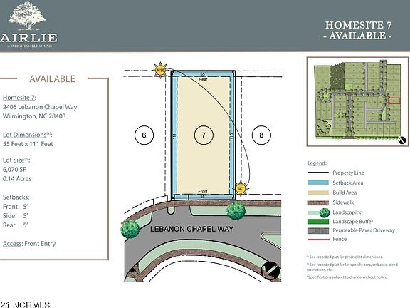Homesite 7 features a front-access driveway and is a great opportunity to buy and build your dream home in this one-of-a-kind location. Designed to encourage walkability within the neighborhood streetscapes, Airlie at Wrightsville Sound features thoughtfully placed parks, upgraded community landscaping, live oak street trees with custom up-lighting, brick herringbone sidewalks, custom street lanterns, Belgian block curbing, cobblestone street accents, and more.