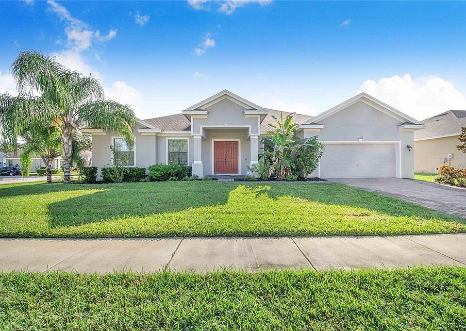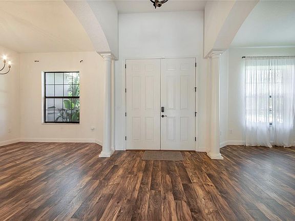 Welcome to this stunning 4-bedroom, 2-bath pool home that blends elegance, comfort, and functionality. From the moment you enter through the double doors, you’re greeted with an open floor plan and wood plank laminate flooring throughout, creating a warm and inviting atmosphere. The home features multiple living and dining spaces, including a formal living room, formal dining room (or office/den), a bright nook, and a spacious family room, offering plenty of room for entertaining and everyday living. The chef-inspired kitchen is a true showstopper, featuring state-of-the-art appliances, granite countertops, a large island with farmhouse sink, stovetop cooking area with vent, and a walk-in pantry. You’ll also love the coffee bar and abundance of counter and cabinet space—perfect for gatherings. The luxurious master suite boasts cathedral ceilings, crown molding, and a walk-in closet with custom built-in cabinetry. The spa-like master bath offers dual sinks, a garden tub, walk-in shower, linen closet, and private water area. The split floor plan places the additional bedrooms on the opposite side, each with high ceilings, crown molding, and spacious closets. A beautifully upgraded second bath with tiled walk-in shower serves bedrooms two and three, while the fourth bedroom—located just off the pool area—offers a peaceful view of the backyard. Step outside through the sliding glass doors to your own private paradise. The screen-enclosed chlorine pool with a covered lanai is perfect for relaxing, entertaining, or grilling out. The vinyl-fenced yard ensures privacy, and you’ll love the variety of fruit trees including banana, cherry, peach, lemon, and fig. Additional highlights include: upgraded light fixtures throughout, a spacious laundry room, and thoughtful details that make this home move-in ready. This home truly has it all—style, space, and a backyard oasis. Don’t miss your chance to own it!