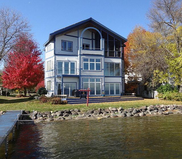 Everyone gathers in the spectacular kitchen in this custom lake home. 3 levels of incredible views and 80 feet of level frontage. First floor is handicap accessible and includes guest bedroom, laundry, sauna, radiant heat, slate and wood flooring. The third story includes private office, floor to ceiling shelving, library ladder, dance floor, exercise room and wet bar. The home is connected from the extra large 3 car garage by the second story bridge.