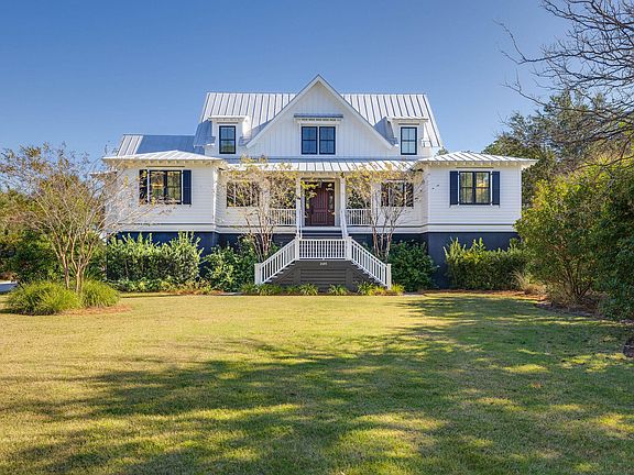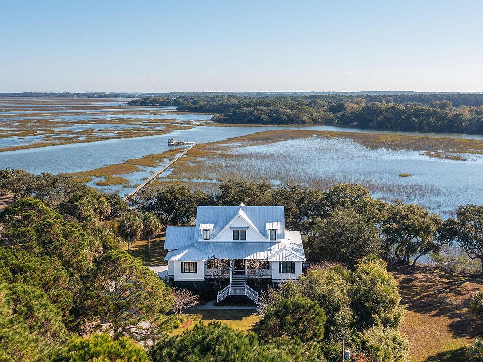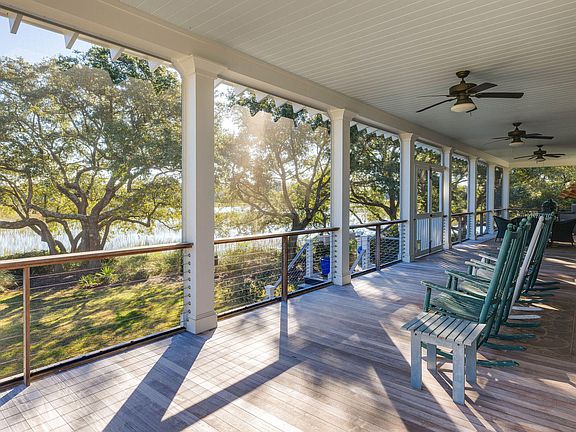 In a setting right out of a Pat Conroy novel, this Carolina creekside farmhouse style home offers the best of Lowcountry living. Constructed in 2017 by Cook Bonner Ebeling, the house features 4 bedrooms each with ensuite bathroom, a designer powder room, combination home office/butler's pantry with second refrigerator, combination media/exercise room, and 2 air-conditioned storage rooms. The open floor plan of living, dining, and kitchen spaces is completely encased in shiplap with coffered ceilings. This space and the primary bedroom all face the gorgeous views of the marsh and creek beyond framed by magnificent live oaks. The gas fireplace is surrounded in tabby, and features a cedar beam sourced from an old house in downtown Charleston for the mantel.The cabinets on either side of the fireplace are topped in walnut with sweetgrass knobs. The beautiful designer kitchen was crafted by a former industrial engineer for efficiency and maximum storage with walk-in pantry, customized cutlery and knife drawers, farmhouse sink, bar sink with seeded glass and lighted cabinets above, double oven electric range with gas cooktop, microwave drawer, warming drawer, and built-in cubby for a coffee maker or Keurig. The large walnut topped kitchen island has cabinets on both sides. These custom cabinets were created by Pritchard Cabinets. The master bedroom suite is full of light and features spacious his and hers closets, dual sinks with roomy cabinets, a large linen closet, free standing tub, and a shower that features a steam shower. The living area is expanded by an extensive porch that wraps around 3 sides of the house. Sitting on 1.25 acres, the property includes a deep water dock with water and electricity on Abbapoola Creek featuring a pierhead, water sports activity floating dock, a jet dock boat lift, swim ladder, and breathtaking 360 degree views. The elevator provides easy access to and from the over 2000 square foot garage that is large enough for 3 cars or 2 cars and a boat plus plenty of storage space for water toys, tools, bicycles, and other items.