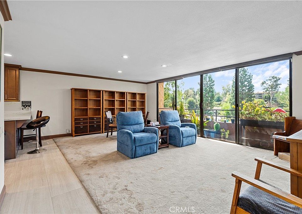 Floor to ceiling windowsOpen concept kitchenVinyl tile flooringSpacious counter seating
