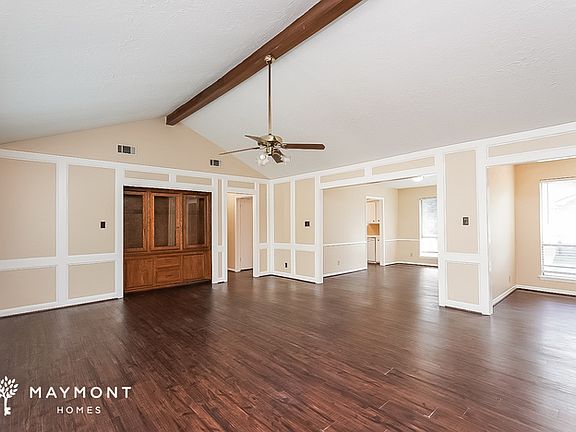 Step inside this inviting 4-bedroom, 2-bathroom residence boasting over 2,000 square feet of comfortable living space. The home welcomes you with a spacious living area highlighted by large windows that bathe the room in natural light, while a vaulted ceiling with exposed beams add a touch of charm. A brick feature wall creates a cozy focal point, setting the tone for gatherings and relaxed evenings.