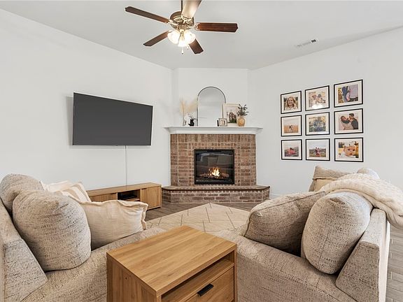 Discover timeless elegance in this full-brick 3-bed, 2-bath masterpiece, ideally located just minutes from Bentonville and only 12 minutes to the Walmart Home Office and Crystal Bridges. Classic brick-and-stone exterior with architectural shingles, covered front porch, and spacious covered back patio overlooking a fully fenced backyard with freshly stained privacy fence and matching storage shed. Inside, enjoy soaring 10-ft ceilings, open-concept living with sleek electric corner fireplace, and a gourmet kitchen featuring gas cooktop, stainless appliances, undermount sink, and wood-look ceramic tile throughout. Master suite boasts grand walk-in closet and spa-like bath. Premium included features: epoxy garage floors, full guttering, ceiling fans in every room, and 2” faux wood blinds on all windows.