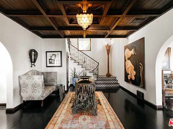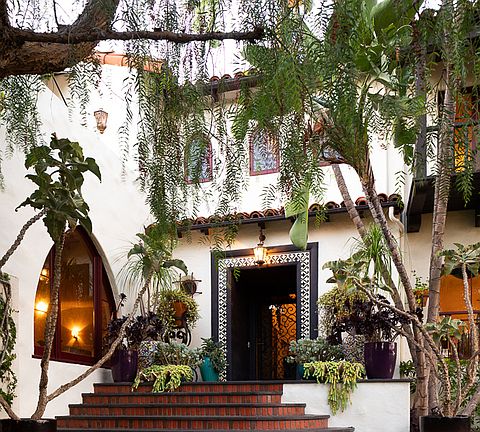 This uber private Spanish Colonial Revival property has been infused with incredible depth and soul by the founders of Studio Shamshiri, who have fine-tuned an eclectic, elegant, and quintessentially California point of view. The soul of the home, a Spanish kitchen with an industrial twist, is highlighted by deep green painted cabinetry, Peruvian walnut counters and graphic hand-stamped concrete tiles, which traverse the adjacent walled courtyard. The courtyard features a dining and cooking areas, a fountain with handcrafted Moroccan tile, and a two-story fireplace with frieze tile, completing the perfect space for outdoor entertaining and dining. Large terraces, balconies, patios, and other outdoor spaces are each given individual attention and form romantic, luxurious outdoor "rooms". Captivating city lights views, lush and sensuous planting, a sparkling pool with black volcanic tile, a detached guest casita and an elevator round out this unforgettable home.