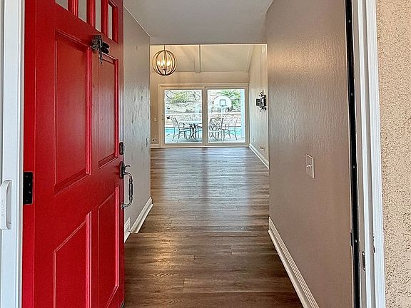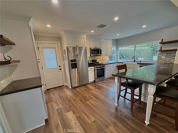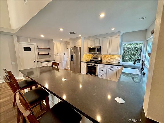 Experience refined single-level living in this exquisitely remodeled residence located in Mission Viejo's coveted El Dorado Tract. Thoughtfully redesigned, this 4-bed, 2-bath home features a custom great room concept, for an expansive, open floor plan ideal for modern living and effortless entertaining. The kitchen boasts a full custom remodel with stainless steel appliances, sleek cabinetry, and generous counter space, refrigerator included. Luxury vinyl plank flooring flows throughout most of the home, enhancing its warm yet sophisticated aesthetic, while being easy to maintain. The beautifully updated guest bathroom adds a touch of spa-like elegance. The backyard is complete with a sparkling pool, relaxing spa, and a mobile pool basketball hoop. Just down the street from Montevideo Elementary School and El Dorado park. Solar panels provide energy efficiency, while Mission Viejo Lake privileges offer exclusive access to boating, beaches, concerts, and lakeside amenities. Washer and dryer are also included, making this home truly move-in ready. The built in desk can be removed from the 3rd bedroom if desired. A rare blend of luxury, comfort, and Southern California lifestyle. This is the one you've been waiting for.